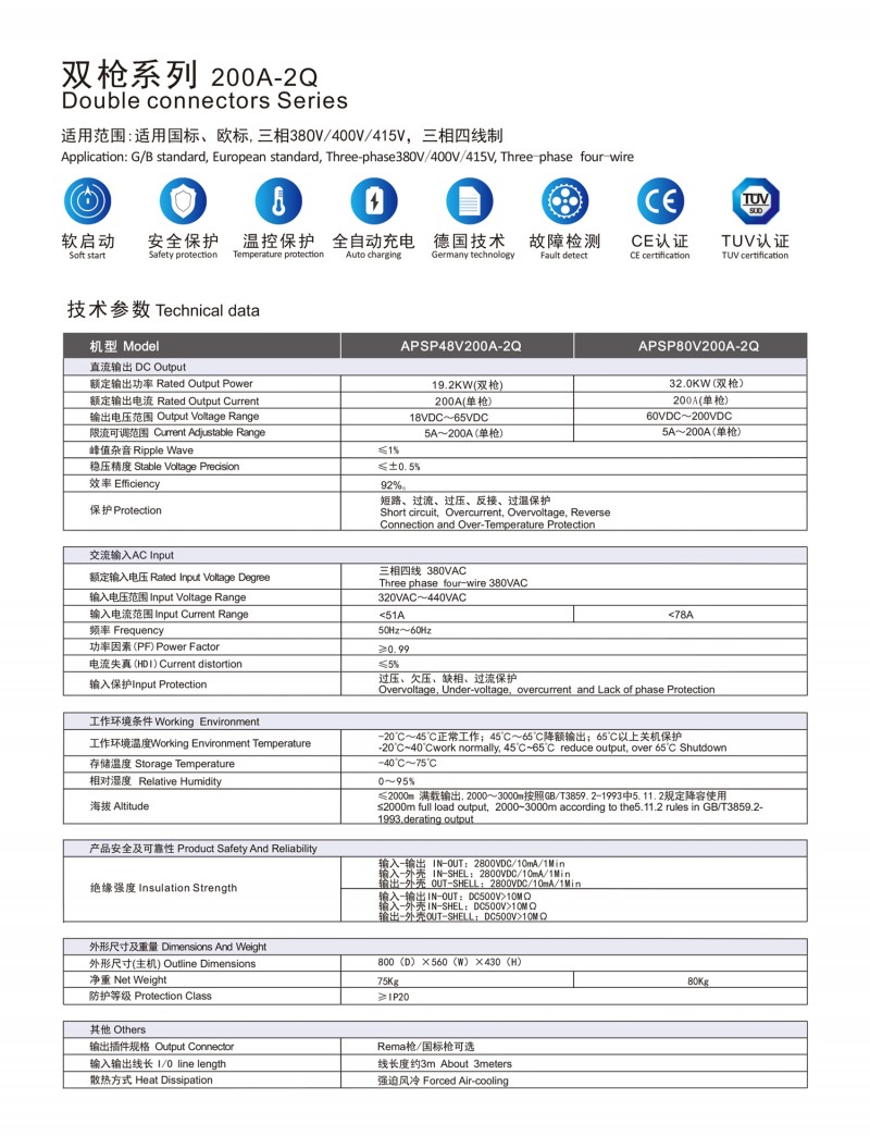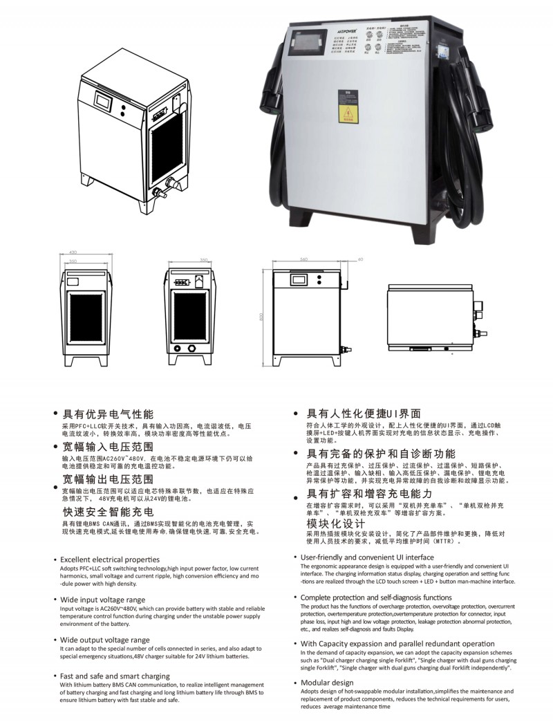 觸摸屏智能操作設(shè)計(jì):告別傳統(tǒng)按鍵方式,給您帶來更現(xiàn)代更具科技智能的操作體驗(yàn) 自動(dòng)充電:插槍自動(dòng)充電,簡化充電流程,便于操作 兼容性高:80V200A兼容48V200A充電 多重保護(hù): 輸出短路,過流過壓保護(hù),反接保護(hù),電流導(dǎo)管保護(hù)等多重保護(hù) 預(yù)約充電功能:避開高峰用電時(shí)段,有效節(jié)省成本 雙語切換:中英文雙語隨需切換,跨越語言障礙,與世界接軌 人性化設(shè)計(jì):充電機(jī)背板內(nèi)部附部件明細(xì)及產(chǎn)品接線圖,方便客戶可更清楚的了解產(chǎn)品,便于維修,提高售后時(shí)效 獨(dú)特設(shè)計(jì): 內(nèi)置電磁鎖驅(qū)動(dòng)模塊,防止臨時(shí)斷電鎖槍 使用壽命更長:功率模塊預(yù)留20%空間,提高模塊的使用壽命 出色內(nèi)部結(jié)構(gòu): 內(nèi)部結(jié)構(gòu)左右出風(fēng),內(nèi)部電路不容易積粉塵,提高充電機(jī)壽命