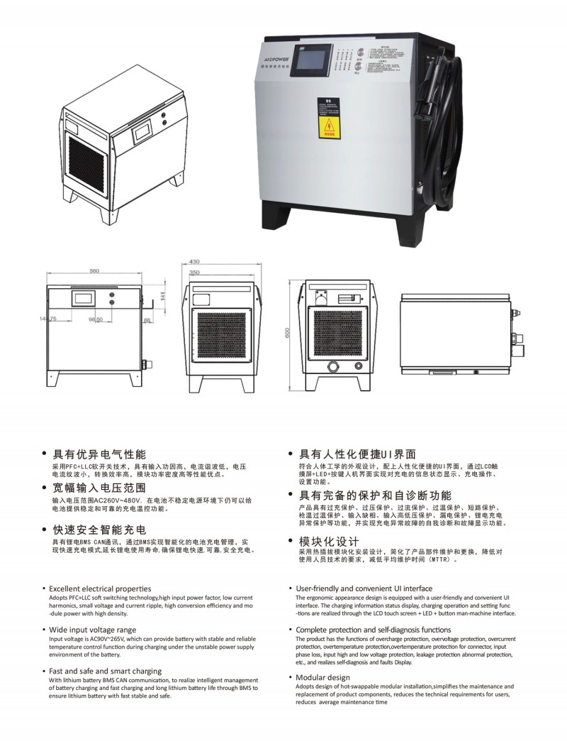 觸摸屏智能操作設(shè)計(jì):告別傳統(tǒng)按鍵方式,給您帶來(lái)更現(xiàn)代更具科技智能的操作體驗(yàn) 自動(dòng)充電:插槍自動(dòng)充電,簡(jiǎn)化充電流程,便于操作 兼容性高:80V200A兼容48V200A充電 多重保護(hù): 輸出短路,過(guò)流過(guò)壓保護(hù),反接保護(hù),電流導(dǎo)管保護(hù)等多重保護(hù) 預(yù)約充電功能:避開(kāi)高峰用電時(shí)段,有效節(jié)省成本 雙語(yǔ)切換:中英文雙語(yǔ)隨需切換,跨越語(yǔ)言障礙,與世界接軌 人性化設(shè)計(jì):充電機(jī)背板內(nèi)部附部件明細(xì)及產(chǎn)品接線圖,方便客戶可更清楚的了解產(chǎn)品,便于維修,提高售后時(shí)效 獨(dú)特設(shè)計(jì): 內(nèi)置電磁鎖驅(qū)動(dòng)模塊,防止臨時(shí)斷電鎖槍 使用壽命更長(zhǎng):功率模塊預(yù)留20%空間,提高模塊的使用壽命 出色內(nèi)部結(jié)構(gòu): 內(nèi)部結(jié)構(gòu)左右出風(fēng),內(nèi)部電路不容易積粉塵,提高充電機(jī)壽命