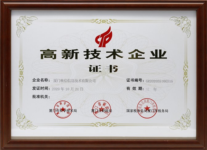 發證機構:   廈門市科學技術局/廈門市財政局/國家稅務總局廈門市稅務局 發證時間 :   2020-10-21