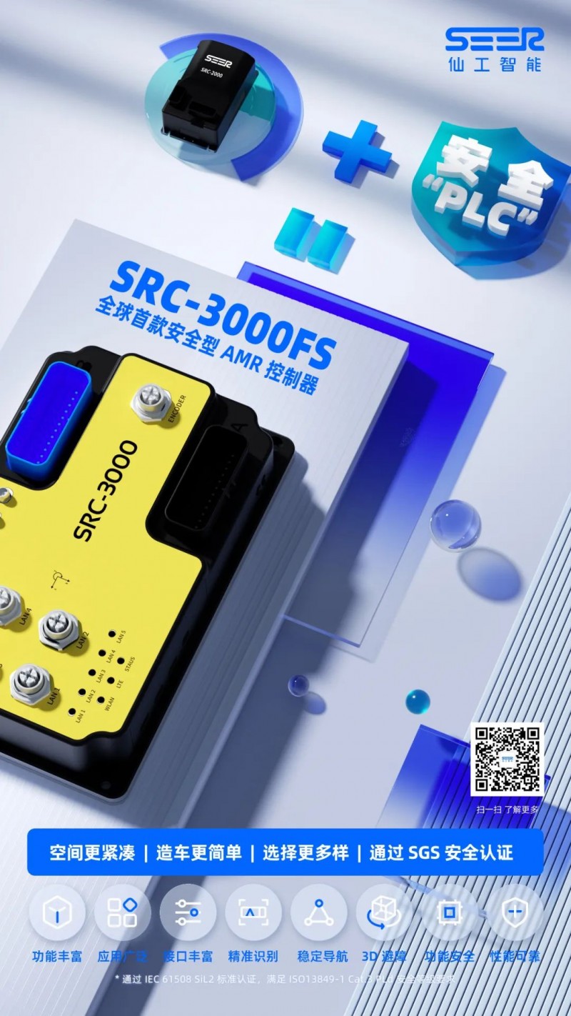 仙工智能 SRC-3000FS 由仙工智能自主研發的安全型 AMR 控制器,通過了 SGS TUV SAAR 功能安全認證。SRC-3000FS 集激光SLAM導航、功能安全于一體的,是目前唯一一個通過該認證的控制器產品。