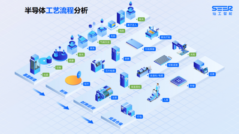 上圖為半導(dǎo)體整個工藝流程,圖表中清晰標(biāo)注了仙工智能在整個半導(dǎo)體生產(chǎn)制程中能做的工作,包括清洗、光刻、離子注入、封測整個環(huán)節(jié)、除高溫固化和光檢以外的封測后段環(huán)節(jié)、成品倉儲整個環(huán)節(jié),上述環(huán)節(jié)均使用仙工智能自有的解決方案。