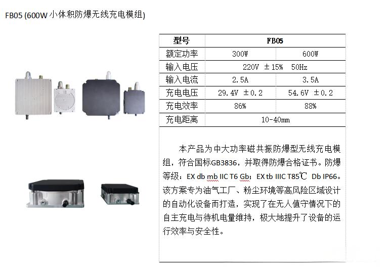 中惠創智FB05具備優異的防爆、防塵和耐腐蝕性能。其輸入電壓為220V±15%(50Hz),充電電壓為54.6V±0.2,最大輸入電流3.5A。采用先進的磁共振技術,突破了傳統無線充電距離的限制,能夠在 10 - 40mm 的充電距離內實現穩定的自主充電。它的問世,無疑為高風險區域自動化設備領域帶來了一場深刻變革。在油氣工廠、粉塵環境等特殊場景中,它解決了長期以來困擾企業的充電安全難題,為自動化設備的穩定運行提供了堅實保障,推動了這些行業的智能化升級進程。