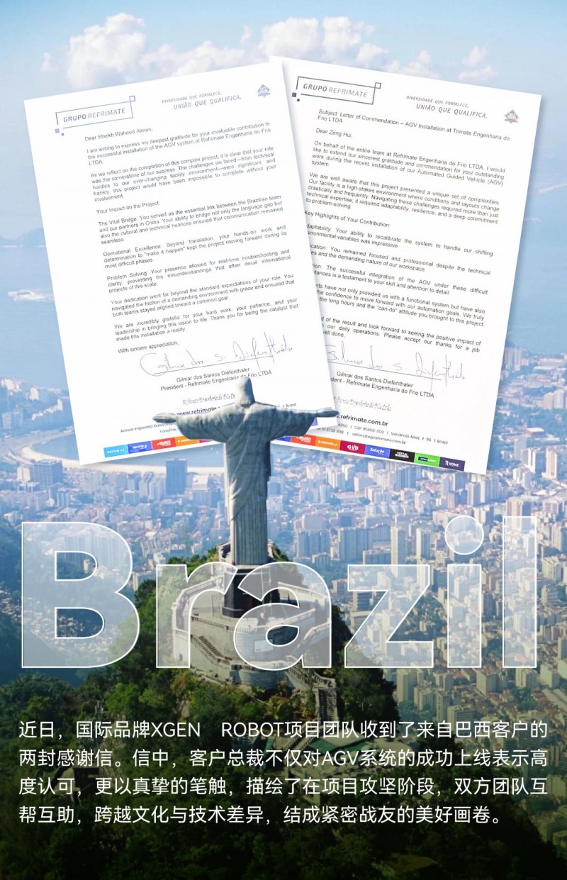 核心提示:近日,國際品牌XGEN ROBOT項(xiàng)目團(tuán)隊(duì)收到了來自巴西客戶的兩封感謝信。信中,客戶總裁不僅對(duì)AGV系統(tǒng)的成功上線表示高度認(rèn)可,更以真摯的筆觸,描繪了在項(xiàng)目攻堅(jiān)階段,雙方團(tuán)隊(duì)互幫互助,跨越文化與技術(shù)差異,結(jié)成緊密戰(zhàn)友的美好畫卷。