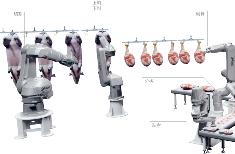 傳統的肉類加工一般由手工完成,存在分割效率低、產品損耗多、工人勞動強度大以及產品安全衛生等諸多風險。TX2-90 HE潮濕環境機器人憑借防水和潔凈的高性能設計,專用于衛生環境的肉類切割加工應用,可采用NSF H1食品級潤滑油,耐受pH2-12 酸堿環境,適應最嚴苛的清潔和消毒。史陶比爾全系列HE潮濕環境機器人完美適用于肉類及禽類切割、剔骨、分揀、裝盒等應用。