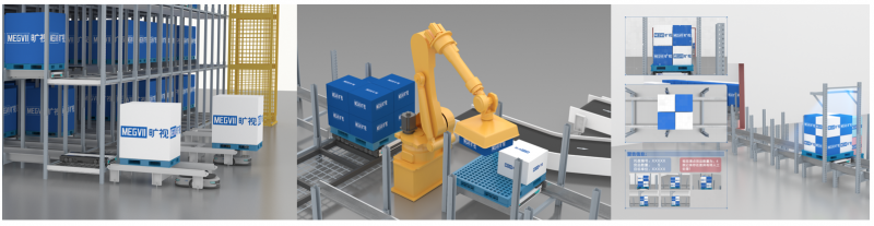 ?曠視四向車+拆碼垛機器人:四向車托盤存儲+機械臂拆碼垛,實現(xiàn)全無人化整箱揀選;使用同一個機械臂進行拆垛和混合碼垛,直接完成出庫托盤聚合;夜間可用機械臂進行同SKU的托盤合并,提高空間利用率。