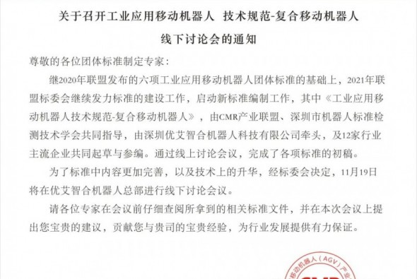 關(guān)于召開《工業(yè)應用移動機器人 技術(shù)規(guī)范-復合移動機器人》線下討論會的通知