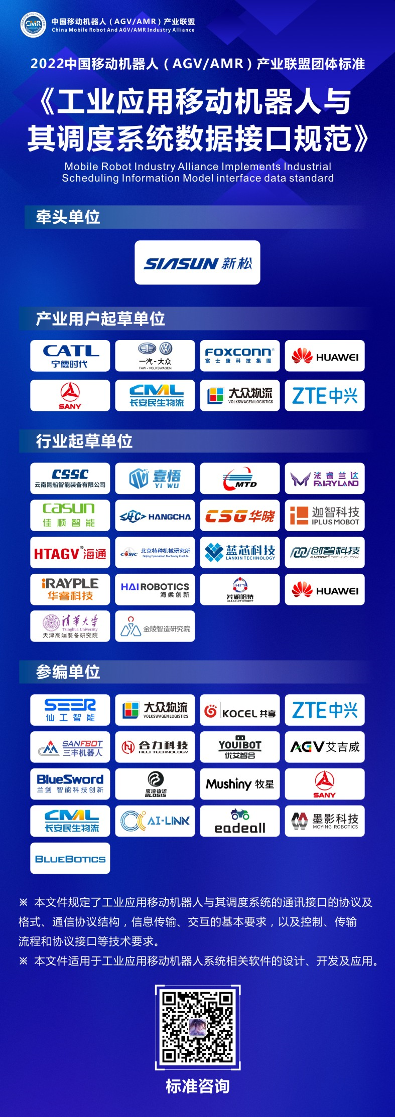 此外,由中國移動機器人(AGV/AMR)產業聯盟標準技術委員會組織、新松機器人牽頭、超過37家主流企業聯合編制的《工業應用移動機器人與其調度系統數據接口規范》正在制定中。