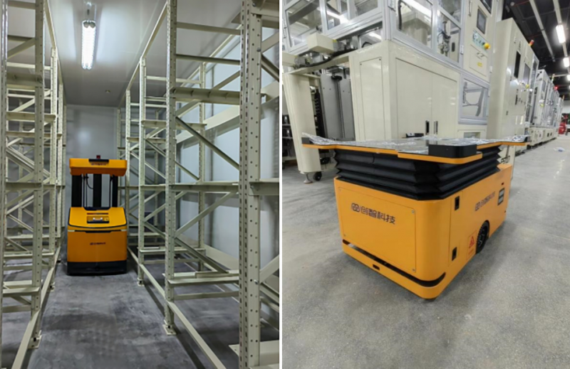 助力客戶實現(xiàn)了車間物料無人化運輸及自動上下料,有效減少了人工,進(jìn)一步提升了生產(chǎn)效率。三、創(chuàng)智科技-數(shù)碼電池后工序智能物流項目本次項目范圍為注液后到包裝出電芯成品的數(shù)個工序,通過專用AGV完成工序間接駁;側(cè)叉式AGV完成高溫房、常溫房自動出入庫和智能化倉儲管理。其中,高溫房常年維持在50℃高溫環(huán)境中,傳統(tǒng)的人工搬運出,作業(yè)員需穿戴防護(hù)服,工作不便效率低下,且勞動強(qiáng)度高,由此,即影響生產(chǎn)效率,同時人員流失率高。創(chuàng)智科技通過創(chuàng)新研發(fā),開發(fā)出了高溫房專用側(cè)叉式AGV,其使用物流通道小,使用庫容高;結(jié)合WMS倉庫管理系統(tǒng),實現(xiàn)了高溫靜置工序無人化、信息化。