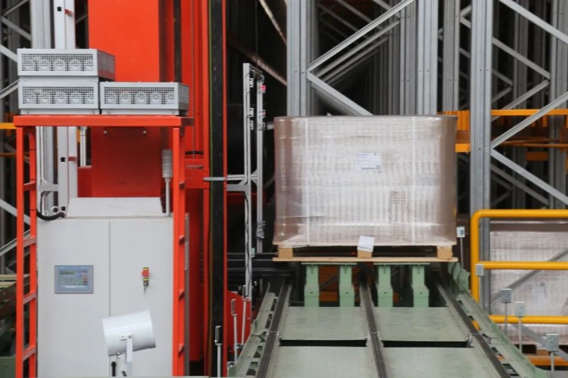 存儲(chǔ)貨架區(qū)配備了18臺(tái)雙立柱堆垛機(jī),其負(fù)載可達(dá)1650公斤,水平運(yùn)行速度可達(dá)120m/min,垂直速度可達(dá)30m/min。輸送至巷道口的托盤就會(huì)由堆垛機(jī)運(yùn)送至對應(yīng)的貨位上完成存儲(chǔ)。