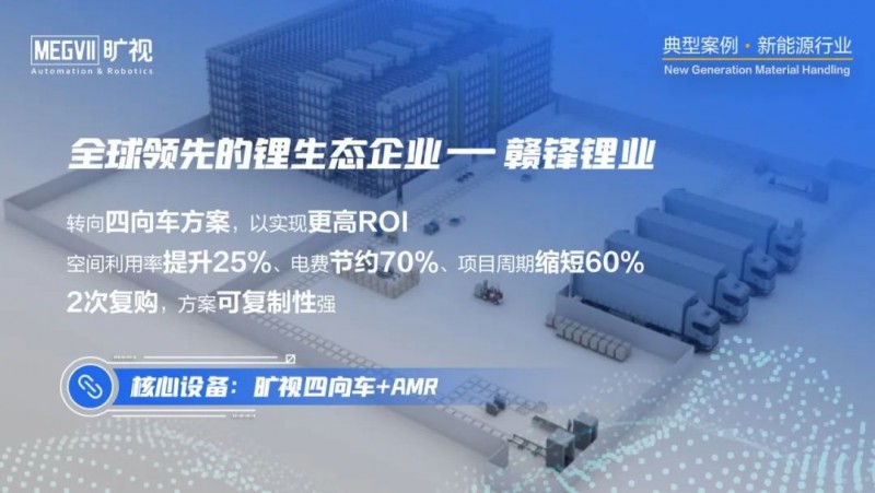 在倉儲物流方面,主要通過自動存取系統(tǒng)(AS/RS)實現(xiàn)高密度存儲和自動化作業(yè),方案以四向車系統(tǒng)或堆垛機系統(tǒng)為主,并涉及與AMR、機械臂、叉車、環(huán)形穿梭車、風(fēng)淋設(shè)備、疊托打帶等不同類型物流設(shè)備的協(xié)同作業(yè)。例如,曠視已贏得贛鋒鋰業(yè)的2次復(fù)購,并助力客戶從堆垛機系統(tǒng)轉(zhuǎn)向ROI更優(yōu)的四向車系統(tǒng);紫宸科技基于曠視“四向車+AMR+河圖”的解決方案對其溧陽工廠倉庫進行自動化升級。