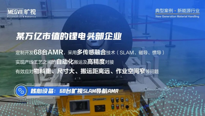 在產(chǎn)線物流方面,主要通過AMR系統(tǒng)實現(xiàn)物料在產(chǎn)線不同工藝間的自動流轉(zhuǎn)。這一場景需要系統(tǒng)具備較強的群體智能,實現(xiàn)高流量、多任務(wù)、多場景協(xié)同作業(yè)。例如,曠視已助力愛旭在其電池生產(chǎn)車間部署140臺SLAM導(dǎo)航AMR,支持電池硅片日產(chǎn)能超300萬片;為一家萬億市值的鋰電頭部企業(yè)提供68臺搭載多傳感融合技術(shù)的AMR,實現(xiàn)電芯生產(chǎn)前序車間的自動化搬運和高精度對接。