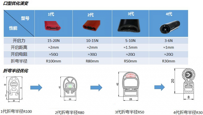 經(jīng)過(guò)公司多次試驗(yàn),其安全觸邊有了新的突破:安全觸邊折彎半徑(折彎半徑一般指的是最小折彎半徑,指在性能正常使用的情況下所能彎曲半徑的最小半徑)由第三代折彎半徑R50提升至第四代R30,同時(shí)膠條防夾范圍也由此前的防夾90°改進(jìn)提升至180°(見(jiàn)圖八),實(shí)際應(yīng)用場(chǎng)景實(shí)現(xiàn)了無(wú)死角的防夾,安全觸邊的改進(jìn)大大減小了移動(dòng)部件對(duì)被撞擊者的傷害。