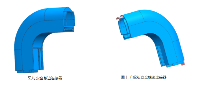 同時(shí)安全觸邊連接器由原來(lái)的整個(gè)轉(zhuǎn)角盲區(qū)(連接器中間無(wú)法穿入導(dǎo)電條,見(jiàn)圖九)提升到了現(xiàn)在的升級(jí)版安全觸邊連接器(見(jiàn)圖十);升級(jí)后的安全觸邊完全消除盲區(qū)的也將兩側(cè)導(dǎo)電條連接了起來(lái),同時(shí)也提升了整體外觀的美觀度。