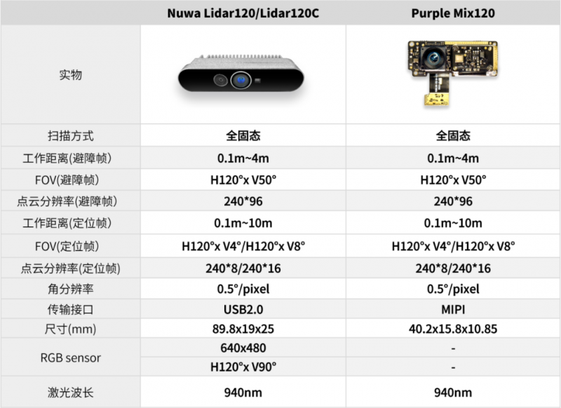 產品將重點針對機器人應用領域,有效解決導航、避障功能模塊分離造成的機器人整機產品形態設計困難、傳感模塊多而成本高的問題。此外,傳統的LDS、單點/多點dToF線掃導航模塊都需要采用機械式或半固態的設計,可靠性易受影響,而Nuwa-Lidar120和PurpleMix120都采用了全固態的方案,產品內部沒有任何的機械振動和微機械振動,是針對產品可靠性和壽命優化最理想的方案之一。