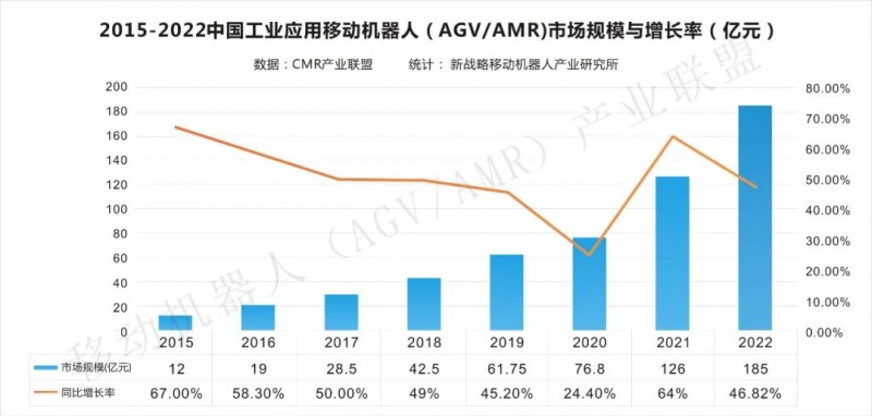 圖表:2015-2022中國(guó)工業(yè)應(yīng)用移動(dòng)機(jī)器人(AGV/AMR)市場(chǎng)規(guī)模與增長(zhǎng)率
