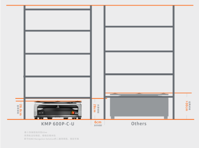 基于KUKA Navigation Solution的二維碼導航技術(shù)KMP 600P-C-U擁有穩(wěn)定出色的導航系統(tǒng),全面優(yōu)化的運動控制精度鏈,可達到毫米級定位精度,具備貨架擺放位置調(diào)整功能,輕松實現(xiàn)1.3*1.3m大尺寸移動貨架的擺放間距6cm需求,為倉庫贏得更多平面空間,大大增加倉庫容積率,進而降低成本。
