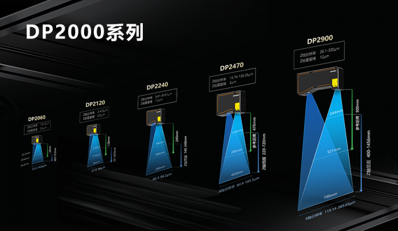 海康機器人3D激光輪廓傳感器目前已發布DP2000和DP3000兩大系列。其中DP2000推出五款型號,單輪廓點數為2048點,最高采集頻率達到10KHz,X軸測量范圍25.2-720mm,Z軸重復精度0.4-24um,線性度±0.01% of MR,且DP2240和DP2470支持紅藍光兩個版本選配。