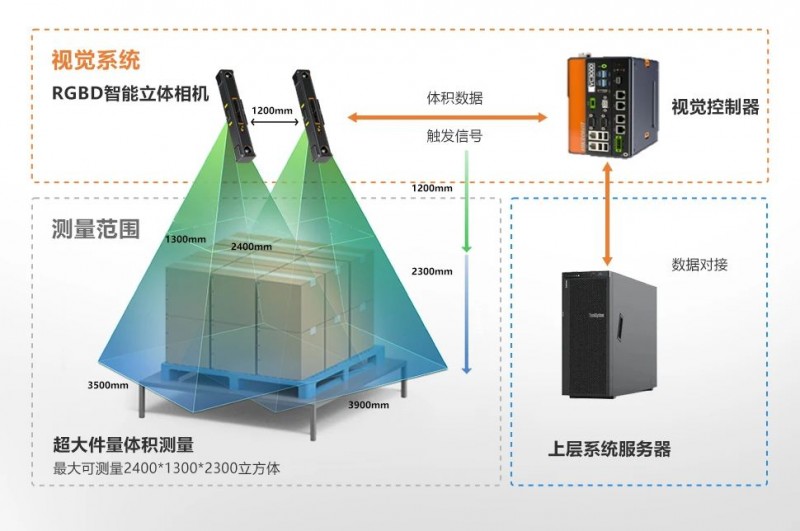 測量精度:±10mm,針對倉儲物流,碼垛類型的超大件物體進行體積測量。