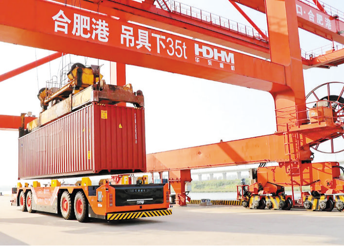 其中,合肥港綜合碼頭是南淝河港區最大的件雜貨和集裝箱裝卸碼頭,也是合肥港智能化水平最高的碼頭。配備3臺岸橋全部加裝自動對位系統,6臺場橋全部改造為全自動場橋,同時配備了2臺國唐“鴻擎F01”IGV無人駕駛集卡車。2022年,合肥港綜合碼頭集裝箱吞吐量達42萬標箱,2023年計劃吞吐量達45萬標箱。