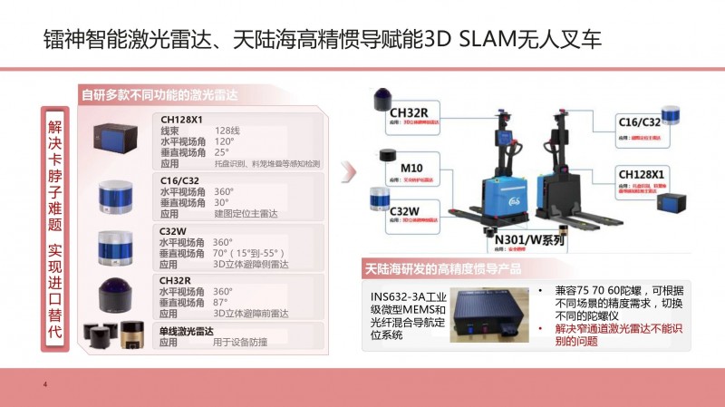 在論壇分享會(huì)上介紹了無人叉車配置的技術(shù)領(lǐng)先全球的鐳神智能激光雷達(dá)系列產(chǎn)品,解決了卡脖子難題,實(shí)現(xiàn)國(guó)產(chǎn)化自主可控,每臺(tái)無人叉車周身配置7-8顆激光雷達(dá),提供豐富穩(wěn)定的全方位立體感知信息,做到更安全、更穩(wěn)定、更可靠。