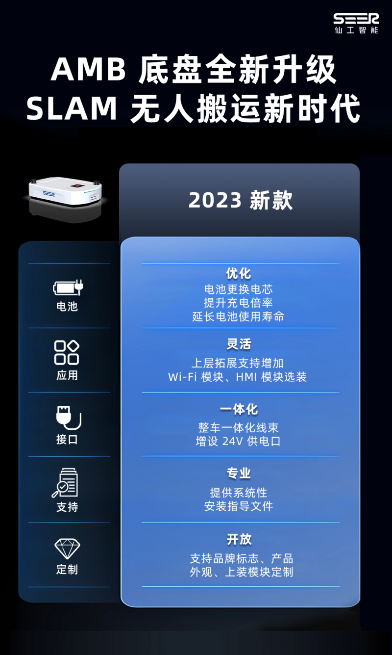 基于對客戶市場的深度分析和技術研發的長期積累,仙工智能在今年再次完成 AMB 底盤多個層面的優化升級。