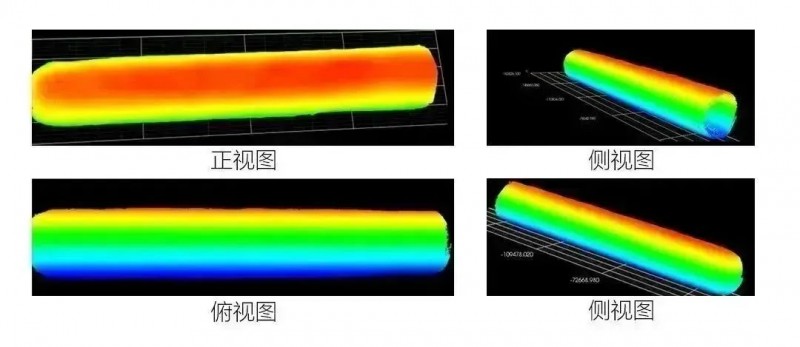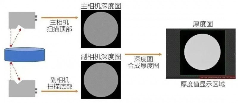 方案優(yōu)勢:通過雙相機對射拼接掃的方式描圓柱體兩個面,輸出圓柱體“厚度”圖像(兩張深度圖差分形成),在“厚度”圖像中可直接顯示圓柱體任意點位的厚度值,以及兩個平面的3D數(shù)據(jù)
