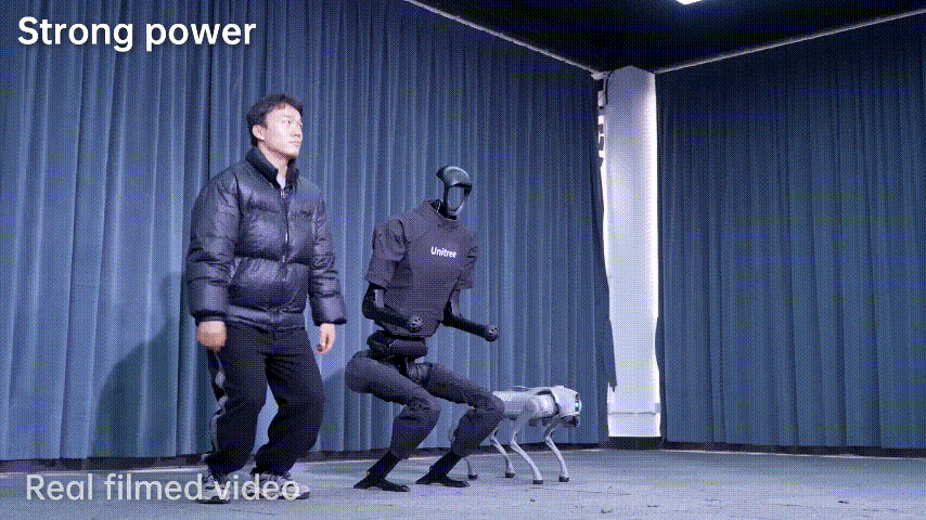 此外,Unitree H1 3.0首次具備雙腳原地跳躍能力,從視頻拍攝角度來看(近地面視角),以Unitree Go2四足機器人(高度40cm)為參照,Unitree H1 3.0的跳躍高度約為20-30cm。雙腳原地跳躍主要檢驗了電機關節(jié)的高爆發(fā)力以及算法的穩(wěn)定性。