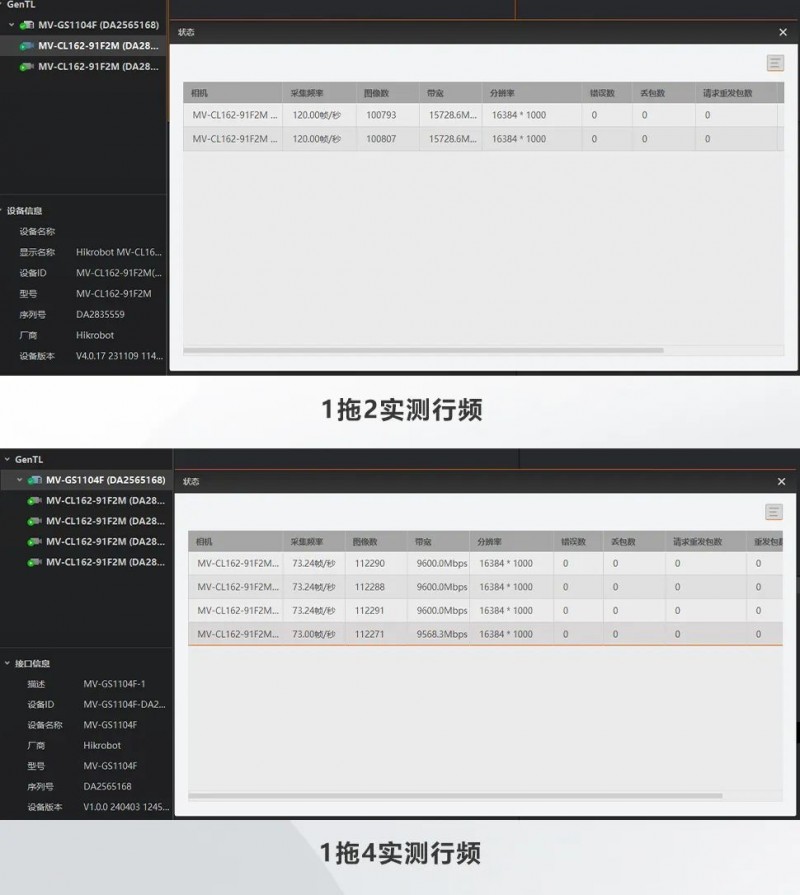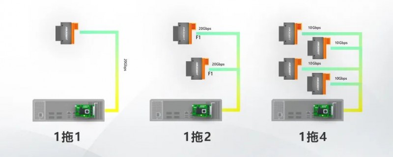 海康機器人推出了不同XoFlink接口數(shù)量的配套采集卡,搭配相機自身支持的1link和2link兩種工作模式,可支持1拖1、1拖2、1拖4等多種連接方式,安裝便捷。客戶可根據(jù)對行頻及整套方案的架設(shè)需求靈活選擇拓撲連接模式。