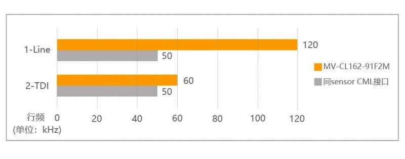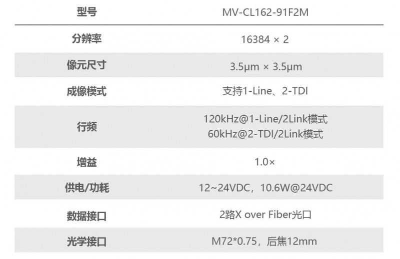 相機(MV-CL162-91F2M)采用兩線COMS Sensor,支持2-TDI成像,且在開啟2-TDI后可保持60kHz行頻高速采集,兼顧高速采集和亮度提升,降低視覺系統(tǒng)對環(huán)境光源的要求。
