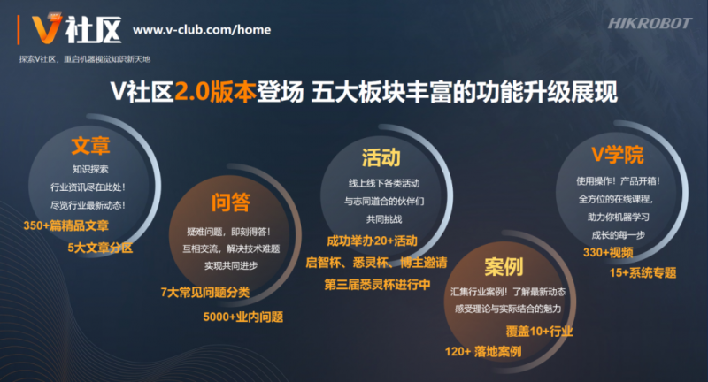 V社區(qū)升級(jí)至2.0版本,已形成文章、問答、活動(dòng)、案例、V學(xué)院五大板塊,匯集350多篇精品文章、330多條講解及應(yīng)用視頻、5000多個(gè)專業(yè)問題、120多個(gè)實(shí)踐案例、20多場活動(dòng),助力機(jī)器視覺愛好者快速學(xué)習(xí)成長。