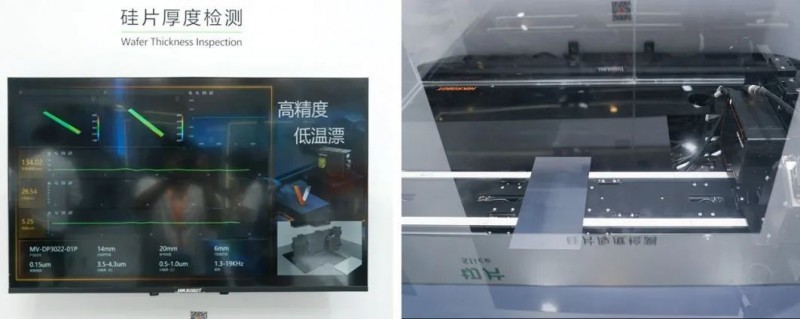 該環節還展示了硅片厚度/側邊檢測方案。其中,六臺3D激光輪廓傳感器測試硅片厚度,六臺相機兩兩對射,同時測量三組數據結果。硅片平均厚度數據重復性精度≤0.5μm,TTV(單線厚度波動)重復性精度≤1.5μm,線痕(單線輪廓高度)重復性精度≤2μm。