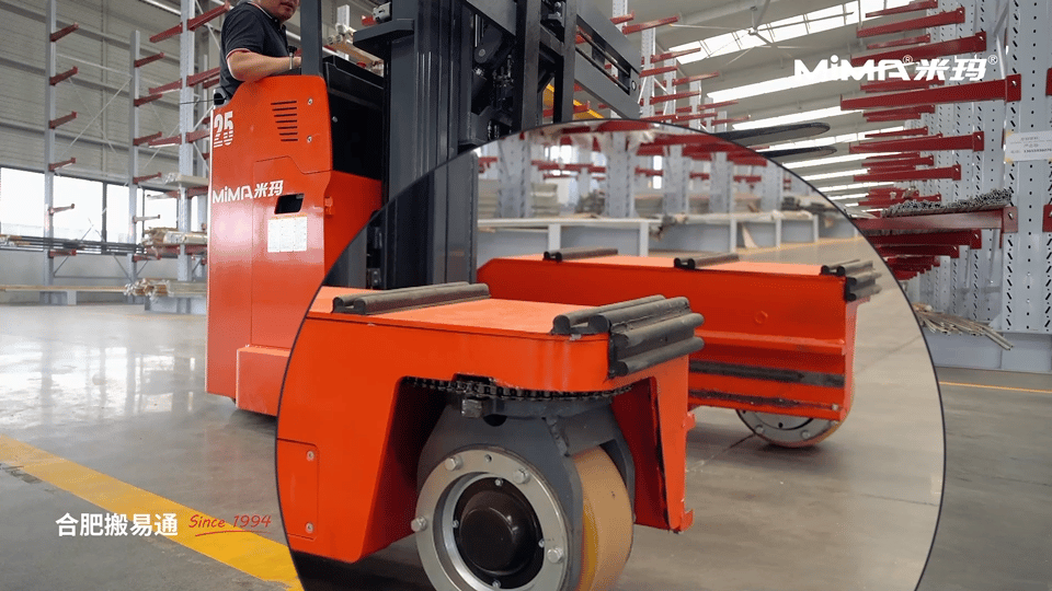 2、為了滿足長重物料的靈活搬運需求,建議客戶采購并使用MiMA米瑪窄體全向叉車MQ25,這款叉車額定載荷2.5噸,擁有多種行駛模式,側行通道更小,能夠完美適配窄巷道作業環境。