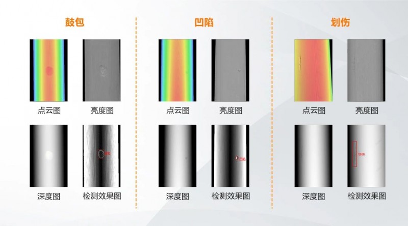 通過多相機環視拼接,可實現線纜/管材外表面點云數據的采集,通過VM 3D軟件,可對線纜/管材表面鼓包、破皮、凹陷、劃傷等缺陷進行有效檢出。