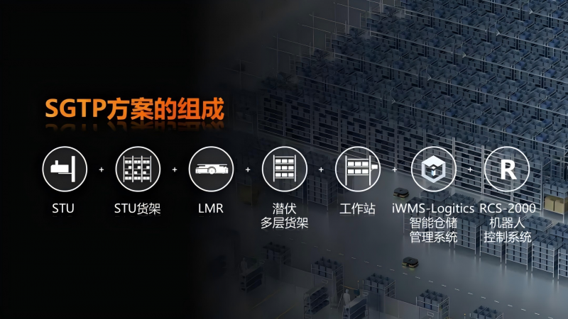 SGTP方案核心的由STU+高位貨架+ LMR+潛伏多層貨架+工作站構(gòu)成,同時(shí)搭配iWMS-Logistics智能倉儲管理系統(tǒng),以及RCS-2000機(jī)器人控制系統(tǒng)。