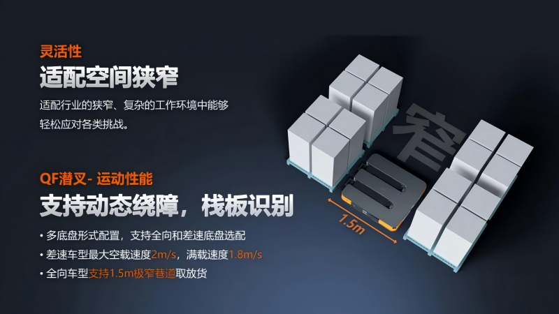 新一代Q1P的空載最高速度達(dá)4m/s,加減速性能大幅提升,兩車緊跟隨切換只需2s,揀選時(shí)切車換箱基本無感,減少任務(wù)切換的耗時(shí)浪費(fèi)。同時(shí)無需輸送線,場地適應(yīng)性和業(yè)務(wù)擴(kuò)展柔性更強(qiáng) 。