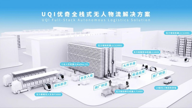 一個(gè)典型的生產(chǎn)物流場景貫穿了原材料卸貨、入庫、倉儲、分揀、出庫并配送至生產(chǎn)車間,加工成成品后,成品入庫、倉儲、分揀及出貨等多個(gè)場景,涵蓋了物料的存儲、分揀、搬運(yùn)和配送四大功能。如何實(shí)現(xiàn)全流程無人化,尤其是各流程之間的自動(dòng)化無縫銜接,一直是行業(yè)痛點(diǎn)。UQI優(yōu)奇此次推出“硬件+軟件+服務(wù)+運(yùn)營”的全棧式無人物流解決方案,具備AI賦能、真無人、高柔性三大特點(diǎn),通過多模態(tài)大模型、視覺算法和語音技術(shù)等多種AI技術(shù)賦能,可一站式柔性調(diào)度多種設(shè)備及機(jī)器人的協(xié)同作業(yè),快速實(shí)現(xiàn)物流場景布局調(diào)整、擴(kuò)建、升級等需求,真正完成無人物流的閉環(huán)。
