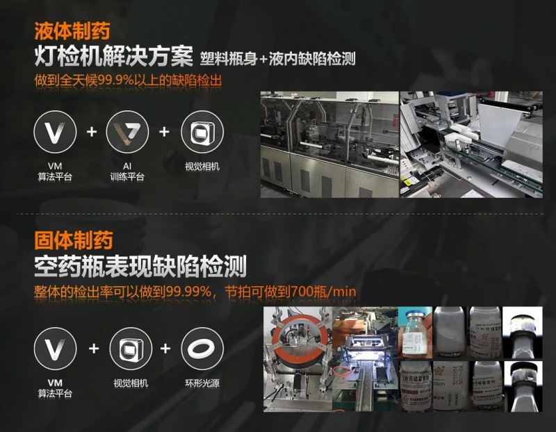 質量安全永遠是制藥領域的第一要求。在液體及固體制藥領域,通過高分辨率面陣相機與深度學習AI算法的結合,??禉C器人提供的機器視覺解決方案能夠精準檢測瓶身外觀缺陷及液內異物,大幅提升檢測準確率與效率,同時保障檢測人員的健康安全。