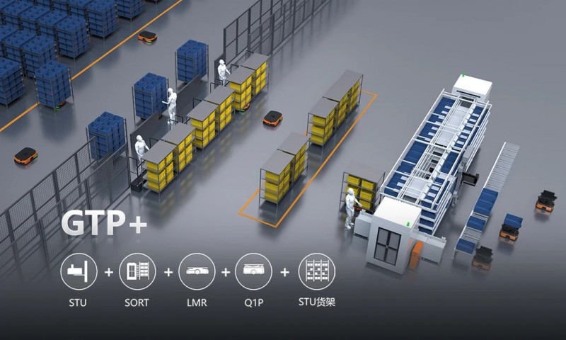 GTP+方案由GTP(Goods to Person,貨架到人方案)總揀、SORT自動分播、對接STU空滿箱交換、Q1P空滿箱轉運構成,適用于醫藥樓層庫混合拆零揀選場景。