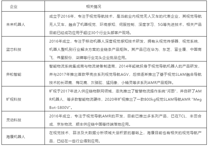 圖表:國內(nèi)主流視覺導(dǎo)航AGV/AMR廠商(本表粗略統(tǒng)計(jì),如有未完善之處,請指正?。?