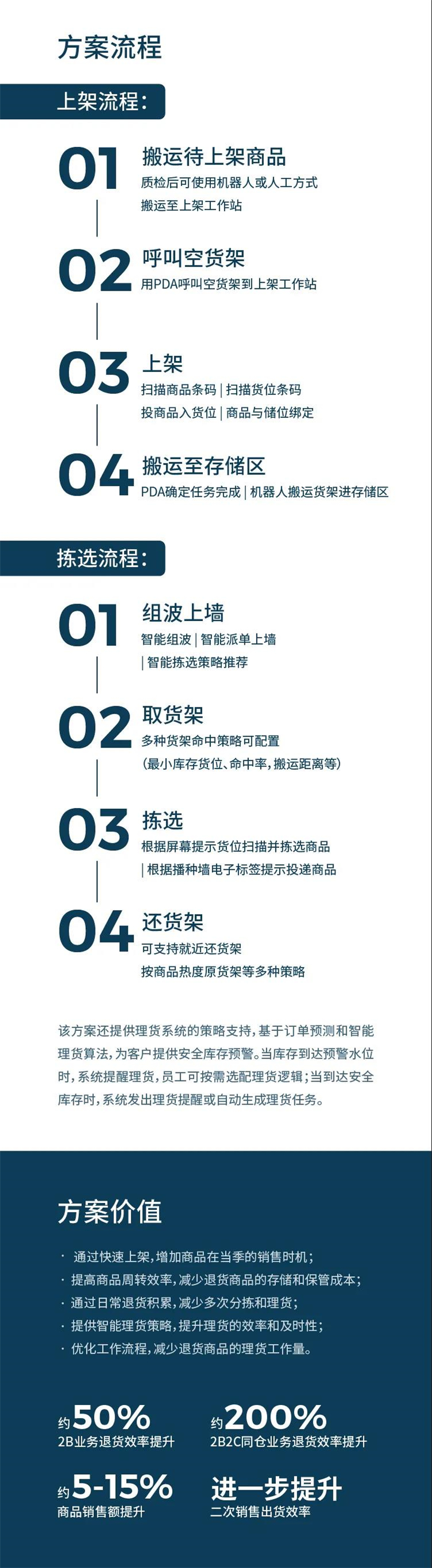 核心提示:方案價(jià)值:2B業(yè)務(wù)退貨效率提升約50%,2B2C同業(yè)務(wù)退貨效率提升約200%,商品銷售額提升約5 -15%,二次銷售出貨效率進(jìn)一步提升。