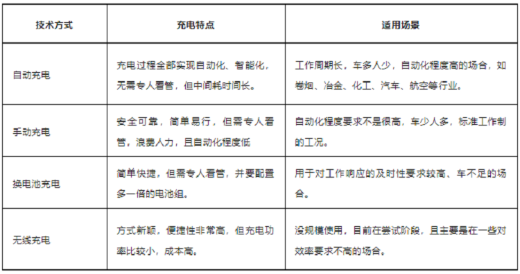 如圖所示,上述四種充電方式中以自動(dòng)充電的方式最為成熟和高效,因此,自動(dòng)充電也成為絕大部分移動(dòng)機(jī)器人廠商使用的方案。不過,美中不足的是,自動(dòng)充電方式耗時(shí)較長(zhǎng),機(jī)器人在電量不足的情況下,需要離開產(chǎn)線工位到達(dá)充電站進(jìn)行自我充電操作,時(shí)間在一到兩個(gè)小時(shí)不等。另外,在機(jī)器人數(shù)量較多的情況下, 生產(chǎn)車間還需配置足夠多的充電樁,這對(duì)工廠空間利用率而言也是一種浪費(fèi)。