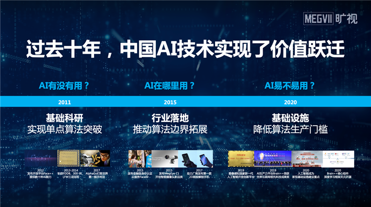過去十年,中國AI技術(shù)發(fā)展經(jīng)歷了三個階段的價值躍遷:一、基礎(chǔ)科研,實(shí)現(xiàn)單點(diǎn)算法突破;二、落地應(yīng)用,推動算法邊界拓展;三、基礎(chǔ)設(shè)施,降低算法生產(chǎn)門檻,以解決各行各業(yè)的問題。作為一家與中國AI行業(yè)共同成長起來的企業(yè),曠視參與了每個階段。