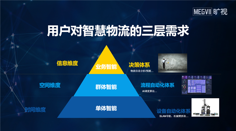技術(shù)、市場、社會、國家政策等多要素的共同作用下,數(shù)智化升級成為企業(yè)實(shí)現(xiàn)降本增效的必然選擇。在曠視看來,當(dāng)前用戶對智慧物流有三層需求: