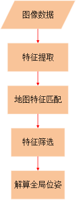 紋理導(dǎo)航算法首先對相機(jī)采集的圖像進(jìn)行視覺特征提取,這里的視覺特征主要指點、線及結(jié)構(gòu)特征等;然后,算法會將提取得到的特征與導(dǎo)航地圖庫中的特征進(jìn)行匹配、篩選,得到地圖庫中對應(yīng)的匹配特征,根據(jù)兩對特征的相互映射、轉(zhuǎn)換關(guān)系解算實時全局位姿,完成AGV設(shè)備的導(dǎo)航定位。