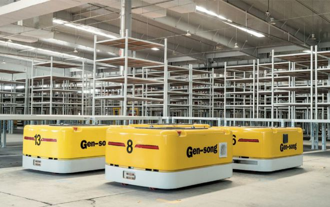 合肥井松為上汽通用東岳打造的倉儲項目,整個倉庫共有貨架956個,每個貨架5層,可以存放料箱34416個,貨物種類與吞吐流量極為龐大。井松為倉庫布置了21臺視覺紋理導(dǎo)航機(jī)器人來實現(xiàn)整個倉庫的自動化搬運,通過中央調(diào)度系統(tǒng)進(jìn)行智能分析,合理調(diào)配每一臺機(jī)器人完成各種物料的進(jìn)出。