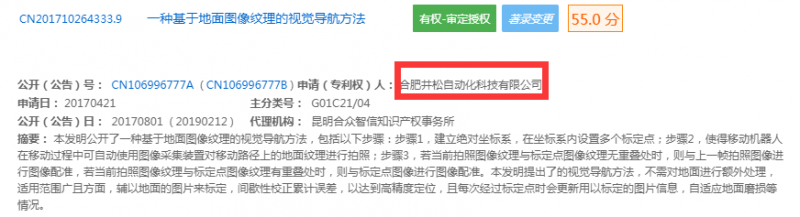 新戰(zhàn)略移動機(jī)器人產(chǎn)業(yè)研究所通過專利檢索發(fā)現(xiàn),目前該導(dǎo)航方式為發(fā)明專利,主要專利人為合肥井松自動化科技有限公司與上海懶書智能科技有限公司所有,發(fā)明人均為劉詩聰。
