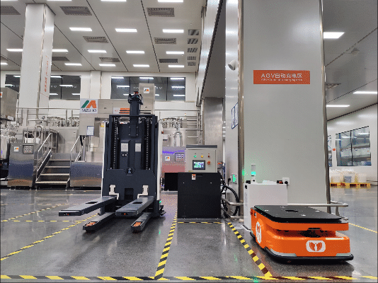 同時,由Gulf-1400-CDD無人叉車機器人負責原材料從原料倉到乳化車間的搬運、空桶的產線返回、半成品從產線到車間的中轉、包材的產線搬運,搭配FMS調度管理系統,實現最優任務分配方案,讓倉儲物流整體效能最大化。