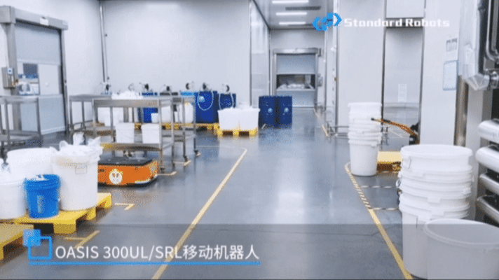 方案中,斯坦德移動機器人OASIS 300UL/SRL負責執行乳化車間、包材車間物料運輸任務,當車間某一設備需要物料時,由員工使用平板電腦發送用料需求,通過FMS調度系統呼叫OASIS 300UL/SRL前來運輸物料。