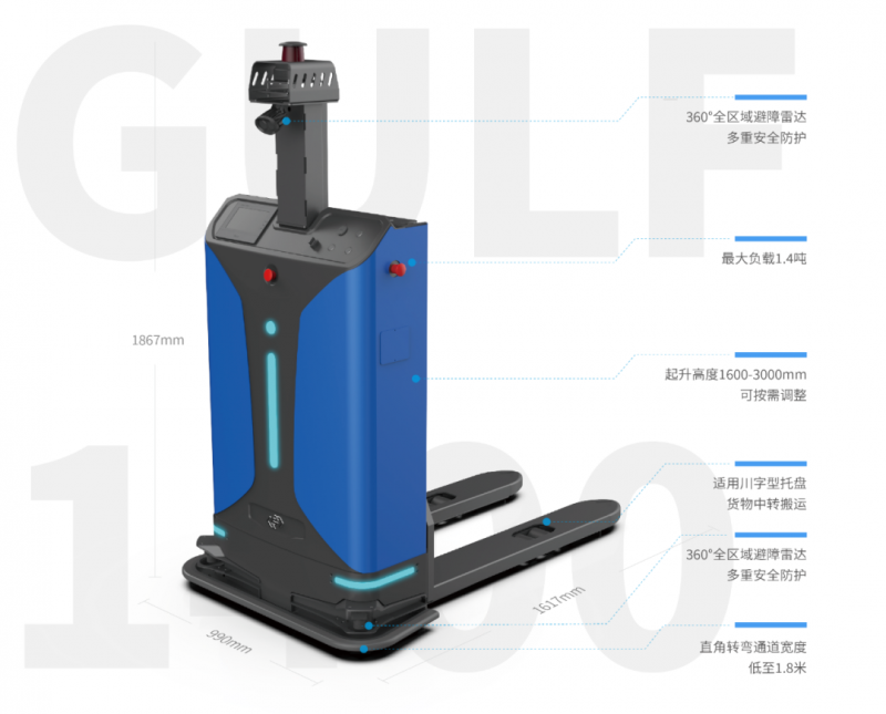 此外,Gulf-1400-CDD無人叉車搭載無線對接模塊,可以對接車間內的自動門,達到自動開關的效果,實現跨場景高效搬運。