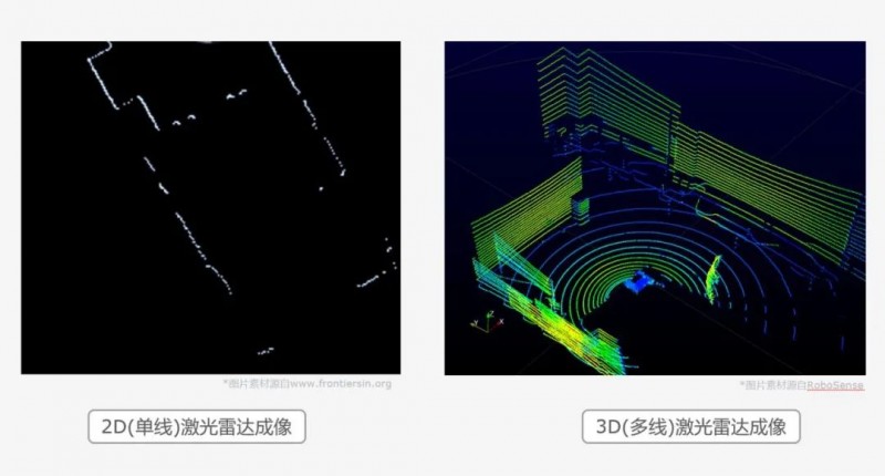 注:2D(單線)激光雷達(dá)成像(左);3D(多線)激光雷達(dá)成像(右)